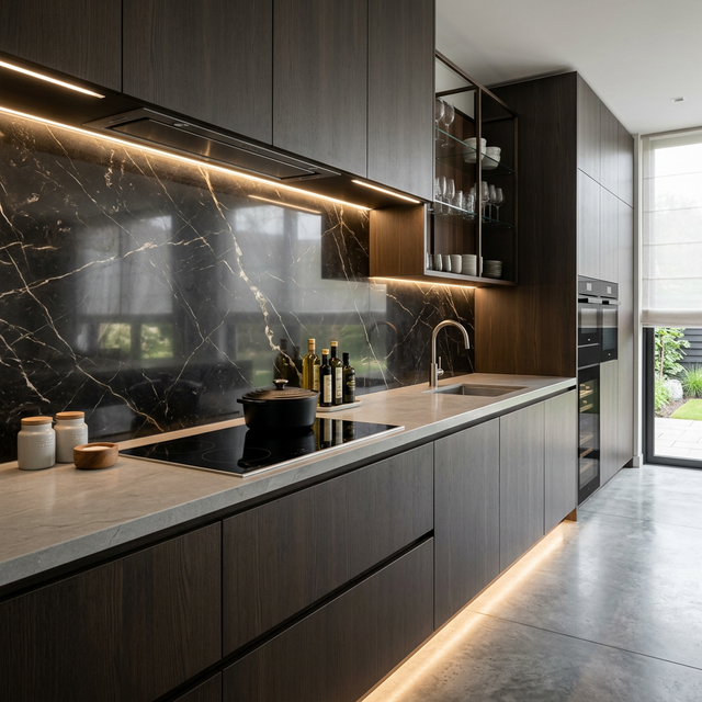 Фартук — это не только защита стен, но и главный акцент вашей кухни. Мы предлагаем решения от практичного ламината до вечного кварца и технологичной керамики.